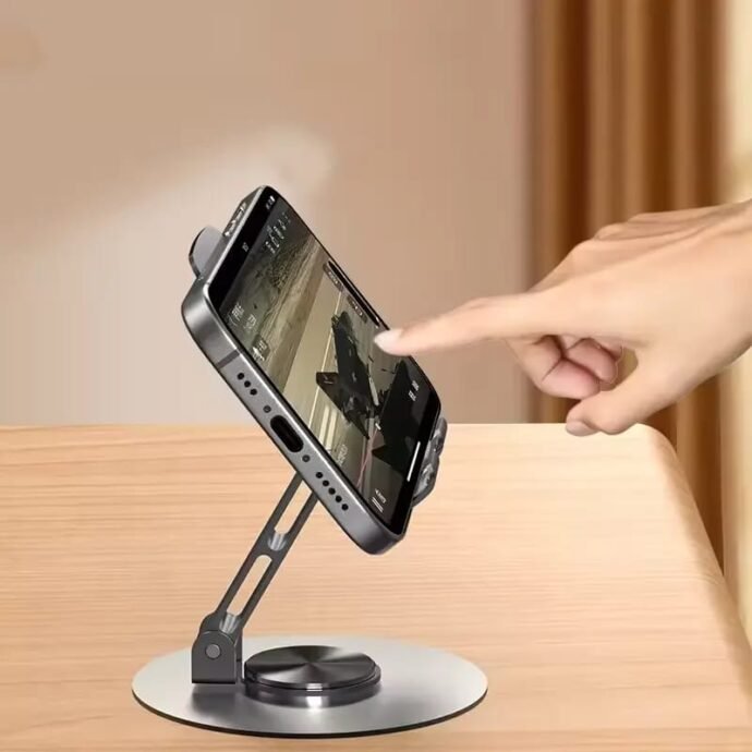 حامل موبايل معدني قابل للتعديل والدوران بزاوية 360 درجة تتعدد استخداماته مناسب لجميع أنواع الأجهزة المحمولة، مما يجعله إضافة قيمة لمكتبك أو منزلك.