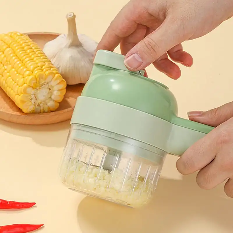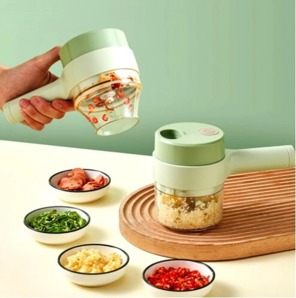 قطاعة الخضار الكهربائية 4 في 1 عبارة عن جهاز مطبخ مدمج يمكن استخدامه لتقطيع مجموعة متنوعة من المواد الغذائية، هرسها وطحنها.